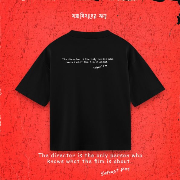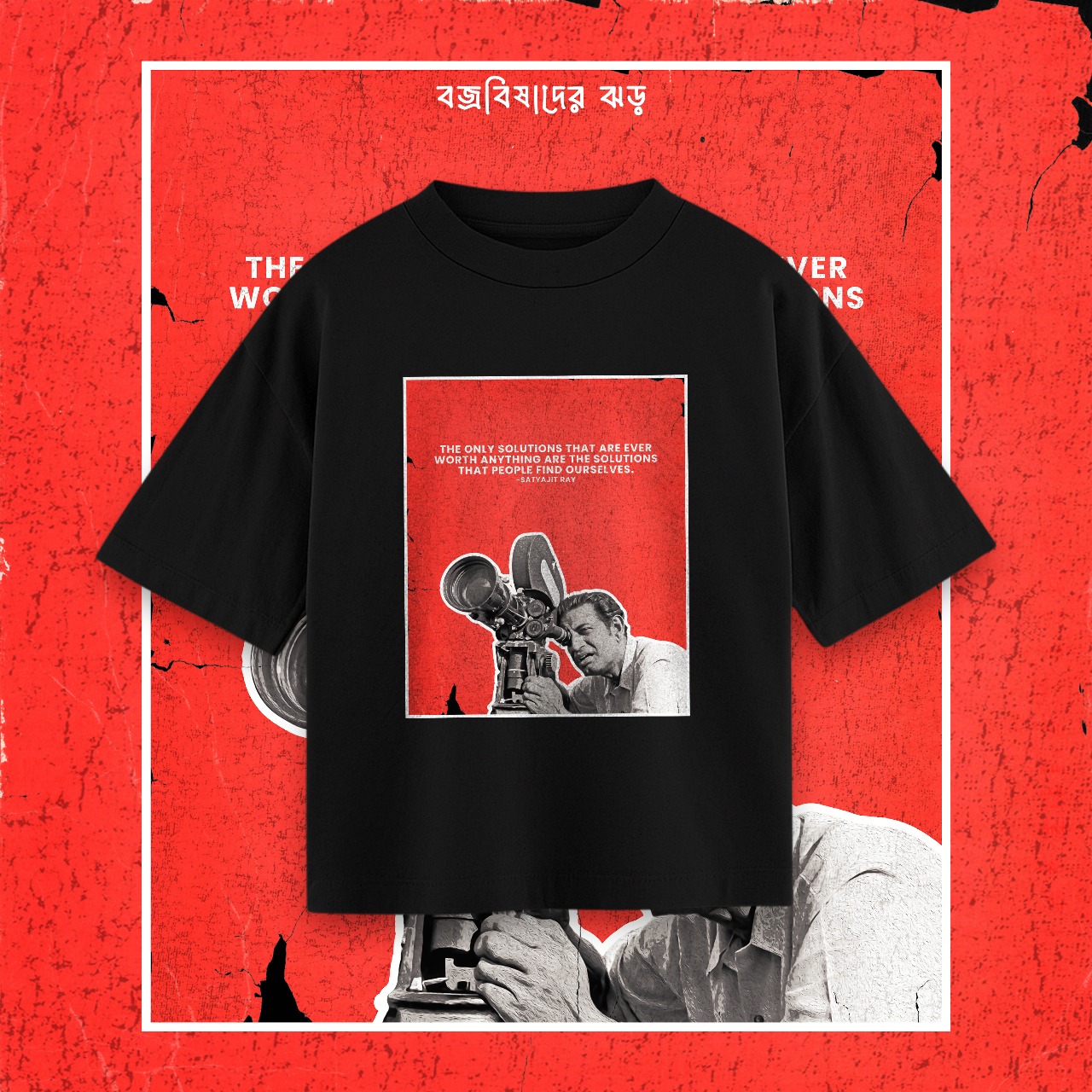 Celebrate the genius of legendary filmmaker Satyajit Ray with this powerful tribute tee. Featuring monochrome imagery of Ray at work with his camera against a striking red backdrop, the design highlights two of his most iconic quotes: