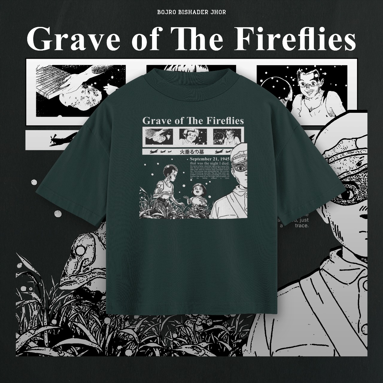 Pay tribute to one of Studio Ghibli’s most profound films with this Grave of the Fireflies graphic tee. Featuring powerful monochrome panels and illustrations of Seita and Setsuko, the design captures the haunting beauty and tragic tenderness of the 1988 classic. With references to September 21, 1945—“the night I died”—this tee is a poignant homage to art, history, and storytelling.